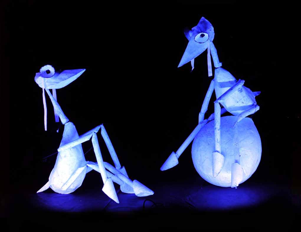 Agiert wird bei ultraviolettem Licht. Nur weiße, helle Farben sind so sichtbar. Die Spieler sind völlig schwarz gekleidet und bleiben beim Spiel unsichtbar und stumm, nur die Puppen, Masken und Requisiten beleben die Bühne.