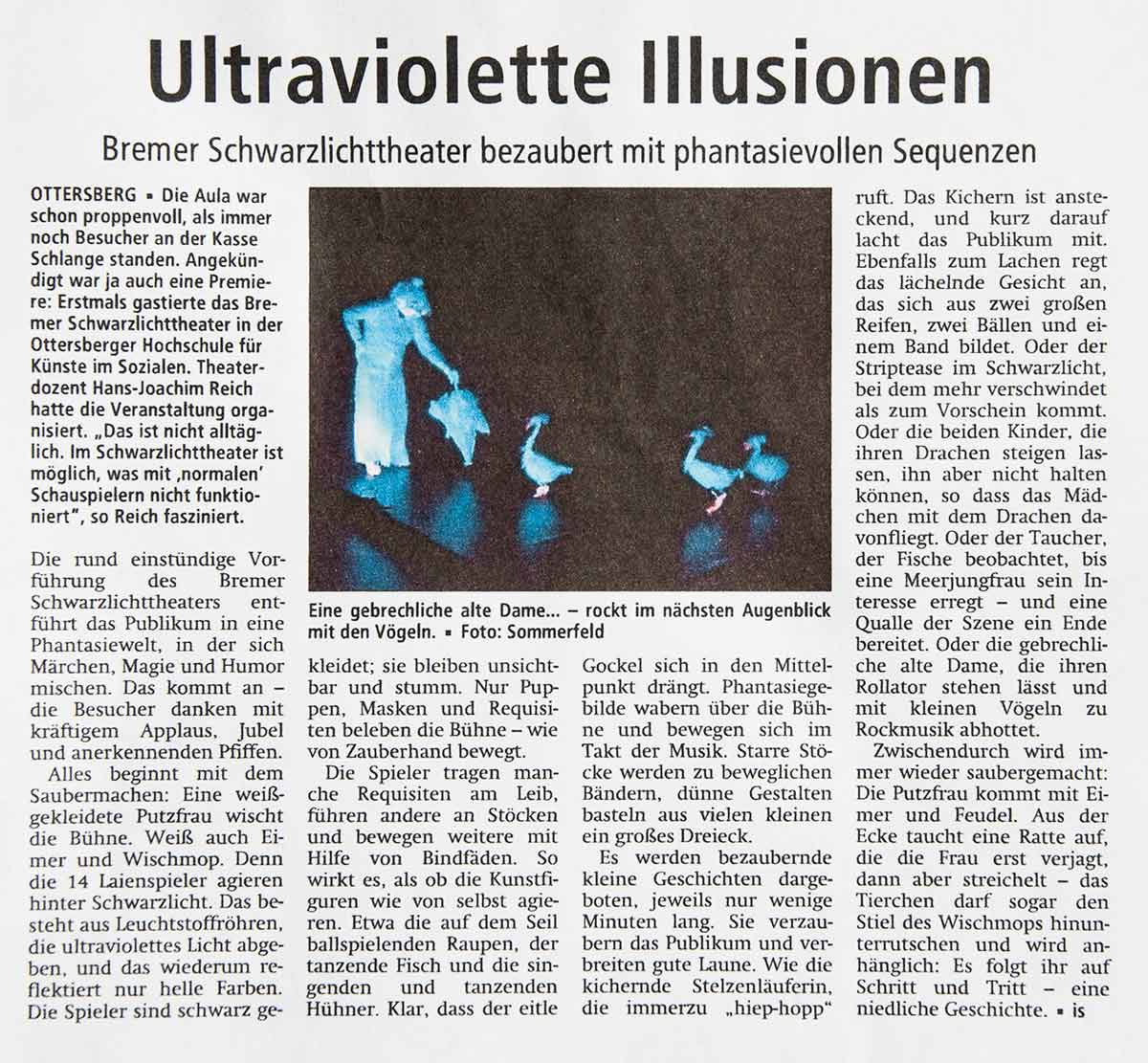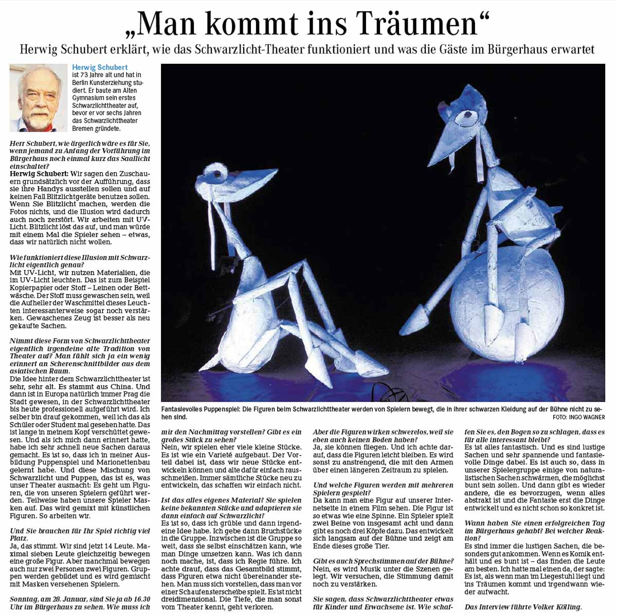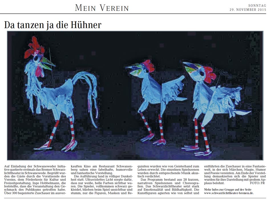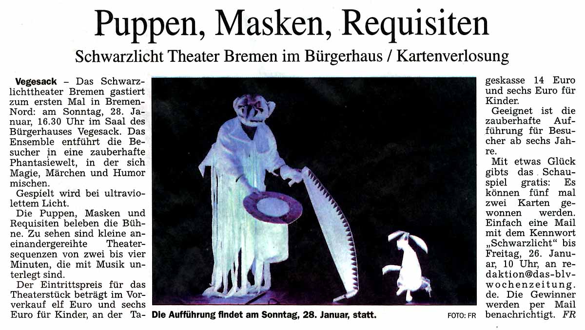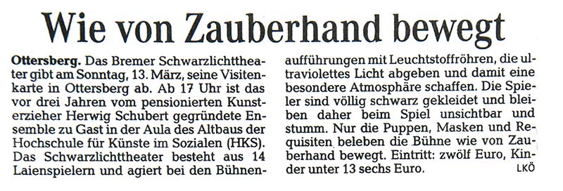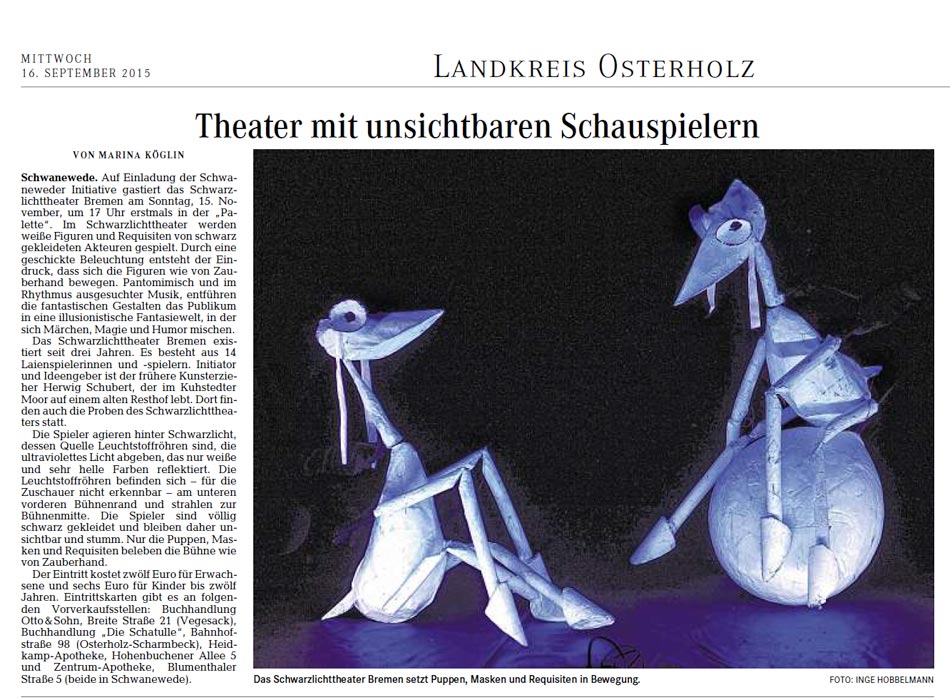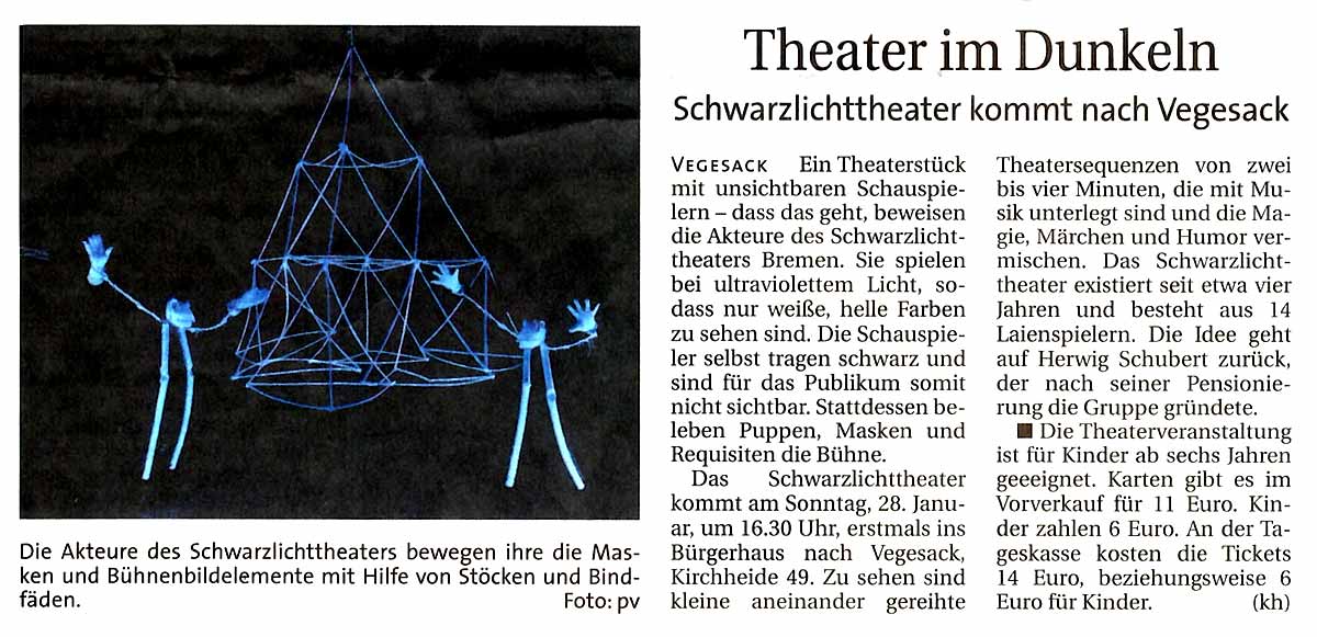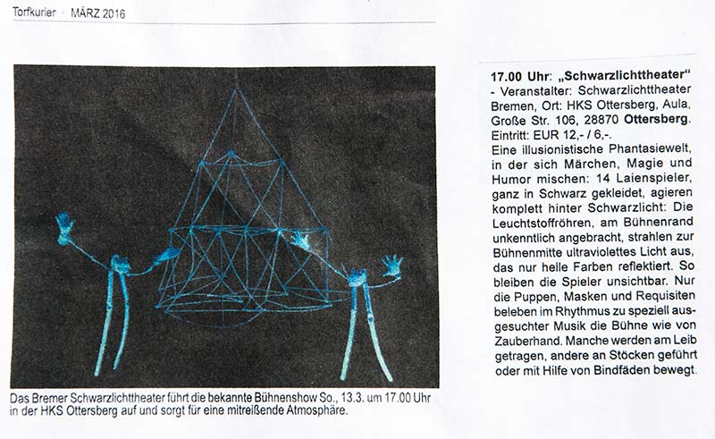 Das Schwarzlichttheater existiert seit ca. 4 Jahren und besteht aus 14 Laienspielern. Der Initiator und Ideengeber ist Herwig Schubert, der nach seiner Pensionierung die Gruppe gründete.